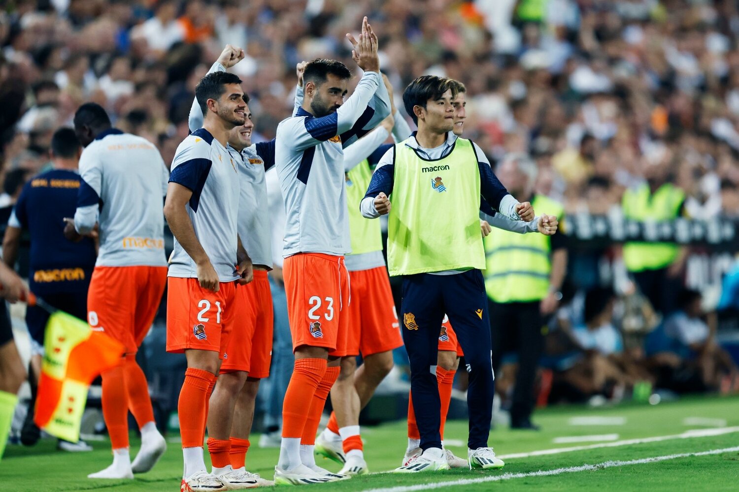 久保はベンチに腰を下ろすと、オレンジのユニホームをゆったりとベンチ前に置き、そしてリラックスした様子で、ブライスらと笑みを浮かべて話をする様子が見られた。そのわずか頭上では、バレンシアサポーターの熱の入った応援が続いていた。