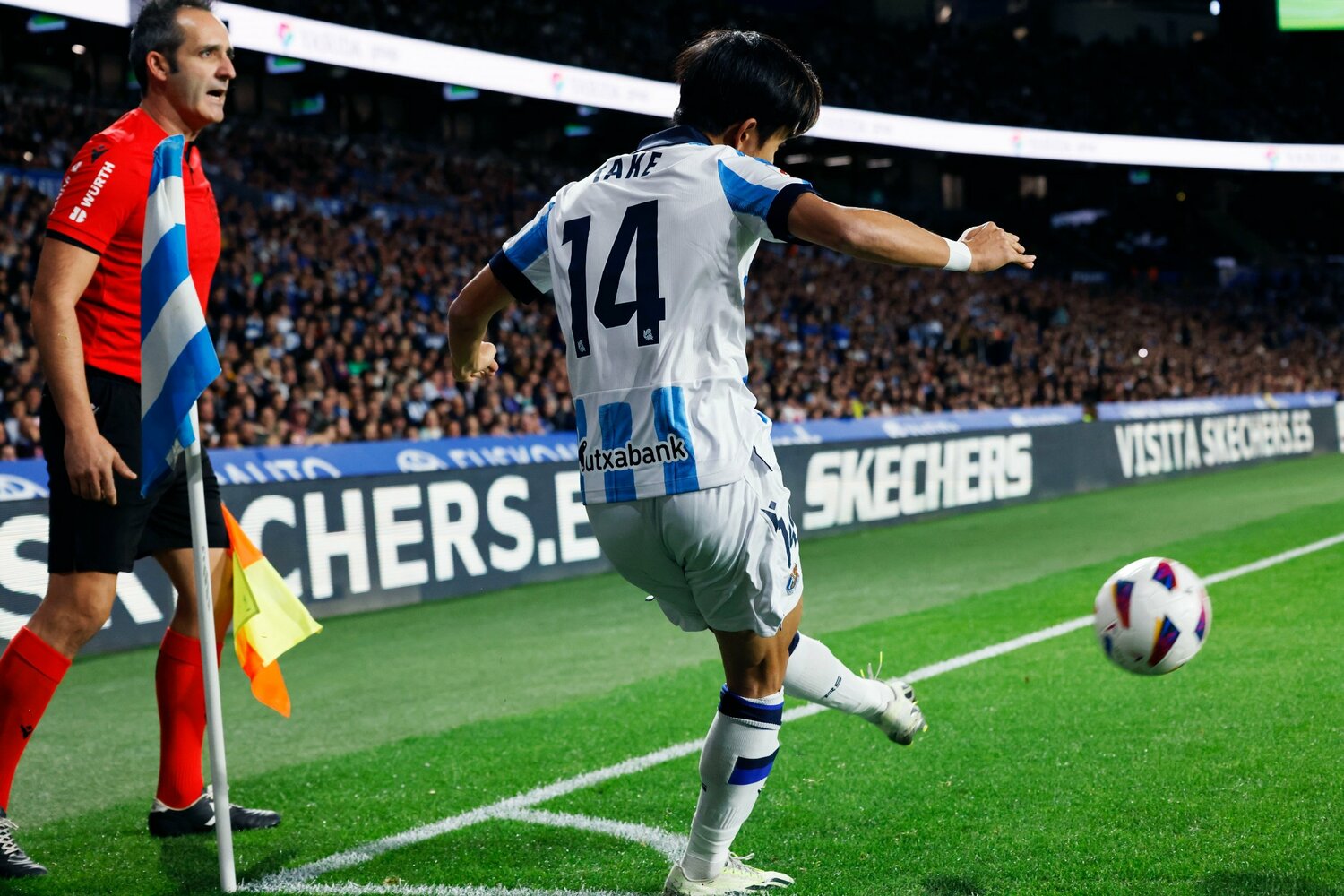 開始より1分を待たず、ボールは右サイドの久保からアイエンを経由し、逆サイドのバレネチェアの元へ。右足で放たれたシュートは間一髪、バルサGKテアシュテーゲンによって弾き出された。直後にも、相手守備陣のミスを見逃さず10番オヤルサバルがシュートに持ち込むと、会場は一気に盛り上がりを見せた。
