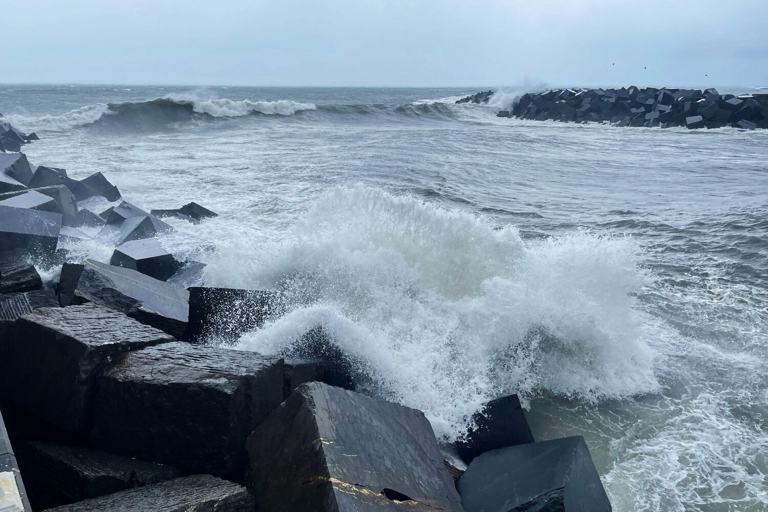 前述の低気圧の影響で海から流れ込む波が、クルサール橋のたもとにぶつかり大きく飛沫を上げていた。観光客や地元の人たちが恐る恐る、そんな様子を眺めていると突然豪雨が降り出す――そんな荒れた天候だった。