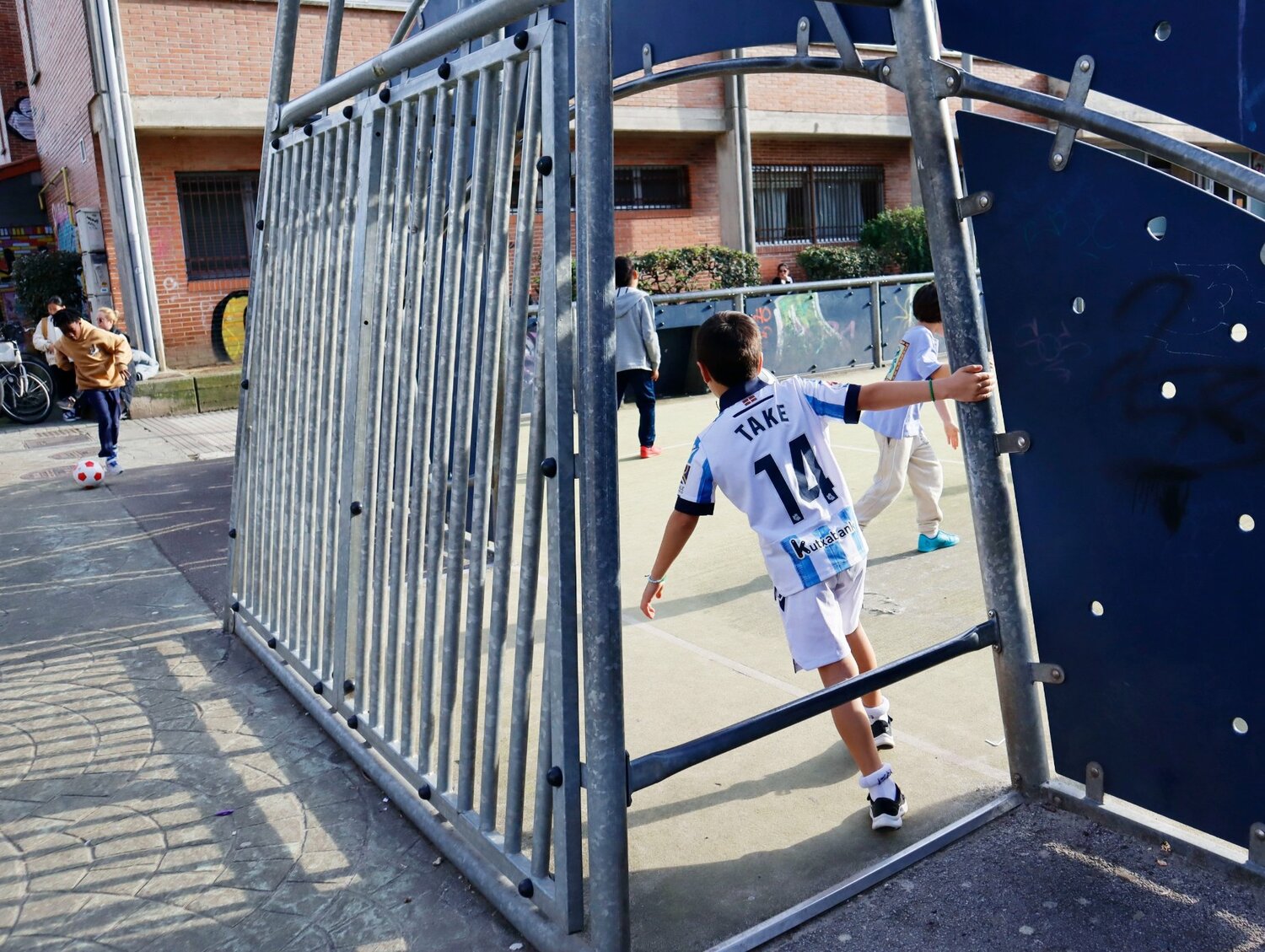 カディスサポーターに話しかける地元サポーターの姿があり、近くの広場では子供たちがボールを追いかけ回している。
