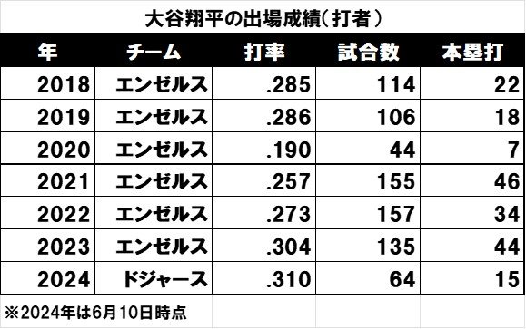 ドジャース大谷翔平(29歳)。6月10日時点で64試合出場、打率.310、本塁打15本