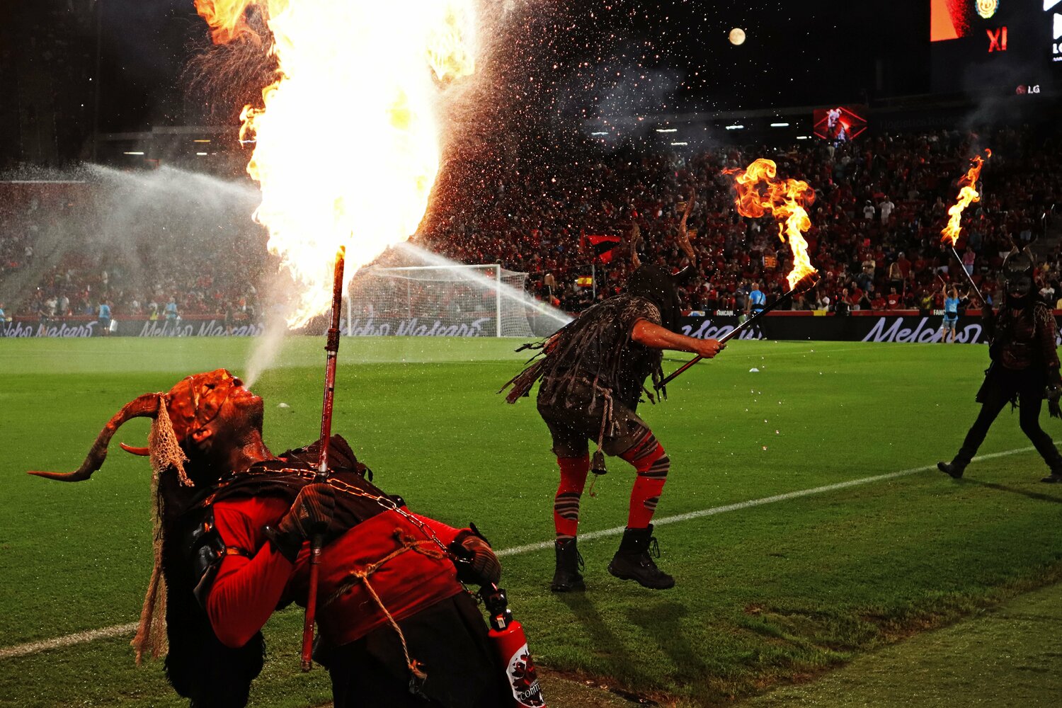 選手入場前になると、ピッチ脇では悪魔に扮したダンサー達の炎を使ったパフォーマンスが場を盛り上げた。そして昨季チャンピオンを讃えるように、マジョルカイレブンの間を通ってマドリーイレブンが入場してくる。