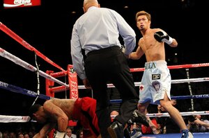 ノーマンがボディへのパンチで餌をまき、佐々木がボディジャブを打ってパンチを引いた瞬間だった。王者が鋭く左フックを振り抜くと、これをモロにくらった挑戦者が背中からキャンバスに突き落とされる。佐々木はそのまま意識を失い、ストレッチャーに乗せられて退場した。KOタイムは5回46秒。派手な倒れ方と失神KOという幕切れは、ドラマティックという言葉がよく似合う佐々木らしくもあった……。