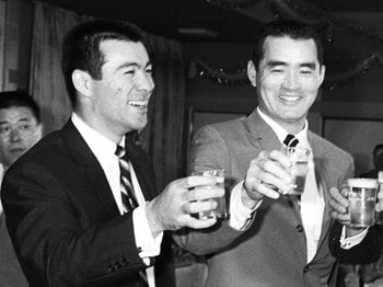 1967年、リーグ3連覇を祝う祝勝会での柴田勲と長嶋茂雄。当時から長嶋に「弟分としてかわいがってもらった」と柴田は振り返る
