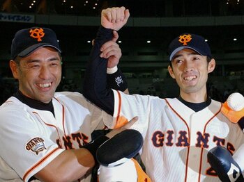 完投勝利を挙げてヒーローインタビューで清原に祝福される巨人・木佐貫洋