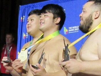 2022年のワールドゲームスで優勝した日体大3年時の花田秀虎(中央)。決勝で破った1学年上の先輩・中村泰輝(左)はのちの横綱大の里だ
