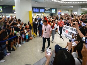 主将の真喜志拓斗を先頭に沖縄尚学の選手たちが姿を現した瞬間。那覇空港は大歓声に包まれた