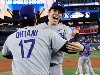 ワールドシリーズ2連覇を達成し、大谷翔平と抱き合う佐々木朗希