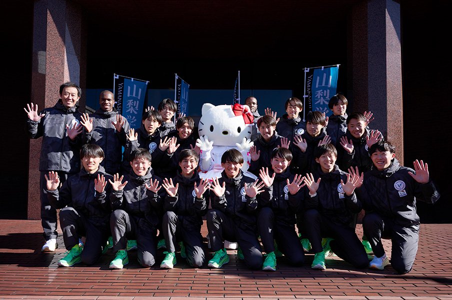 12月12日、山梨県甲府市。八ヶ岳おろしと呼ばれる甲府盆地特有の北風が吹くなか山梨学院大学のキャンパスでは、年明けの駅伝大会に向け、選手を激励する壮行会が行われた。チームジャージを身に纏った弓削征慶主将が「シード権獲得を目指して、チーム一丸となって走り切ります」と宣言すると、ハローキティが激励品の贈呈に登場。弓削主将に応援タオルを手渡すと、その愛らしい姿に会場に集まった学生や教職員の顔に笑みが広がった。