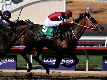 BCクラシックのゴールを先頭で駆け抜けたフォーエバーヤングと坂井瑠星。日本競馬史に残る偉業を成し遂げた瞬間だった