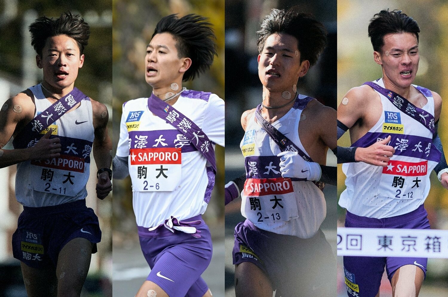 駒澤大学の4年生4人衆。左から箱根3区の帰山侑大、6区の伊藤蒼唯、8区の山川拓馬、10区の佐藤圭汰