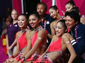 ロンドン五輪、新体操の団体決勝で得点を見守るサイード横田仁奈さん(前列中央)らフェアリージャパンの選手たち