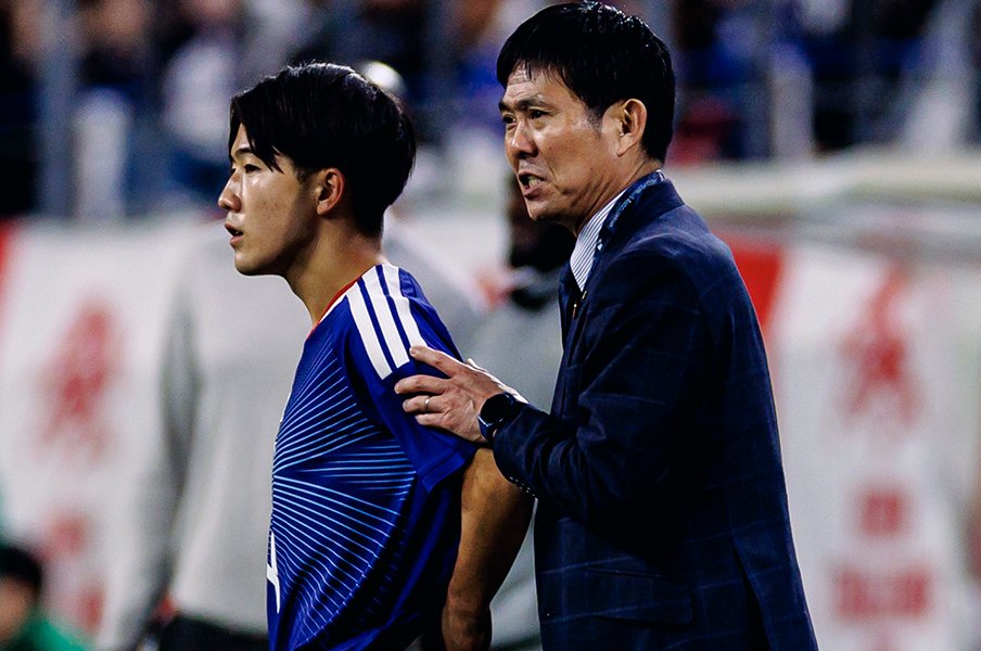 森保一監督に指示を受ける佐藤龍之介。出場機会を大きく増やした1年を経て、ケガ人続出の日本代表にあってW杯出場はなるか