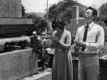 西武監督時代の1982年、地元・呉市の家族の墓前で夫人とともに優勝報告をする広岡達朗