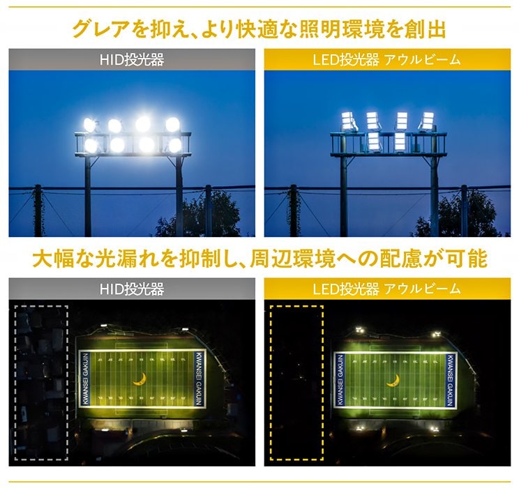 アウルビームERは、パナソニック独自の光学設計技術により、グレアを抑え競技者がプレーしやすく、周辺環境にも配慮した照明環境を実現。①光漏れの抑制:競技場外の周辺環境への光漏れを大幅に抑制し、近隣住民の生活や農作物の発育を阻害しない。②グレアの低減:競技者が感じる眩しさを低減し、プレーに集中できる快適な環境を提供。③高効率化:一般HID投光器からの同台数置き換えが可能。LED化のメリットを最大限に活用。④軽量化:従来よりも簡単に施工が可能な軽量設計。