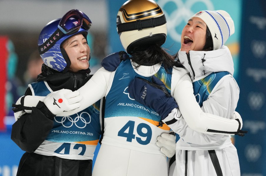ミラノ・コルティナ五輪女子NHで銅メダルを獲得した丸山希を称える高梨沙羅と伊藤有希
