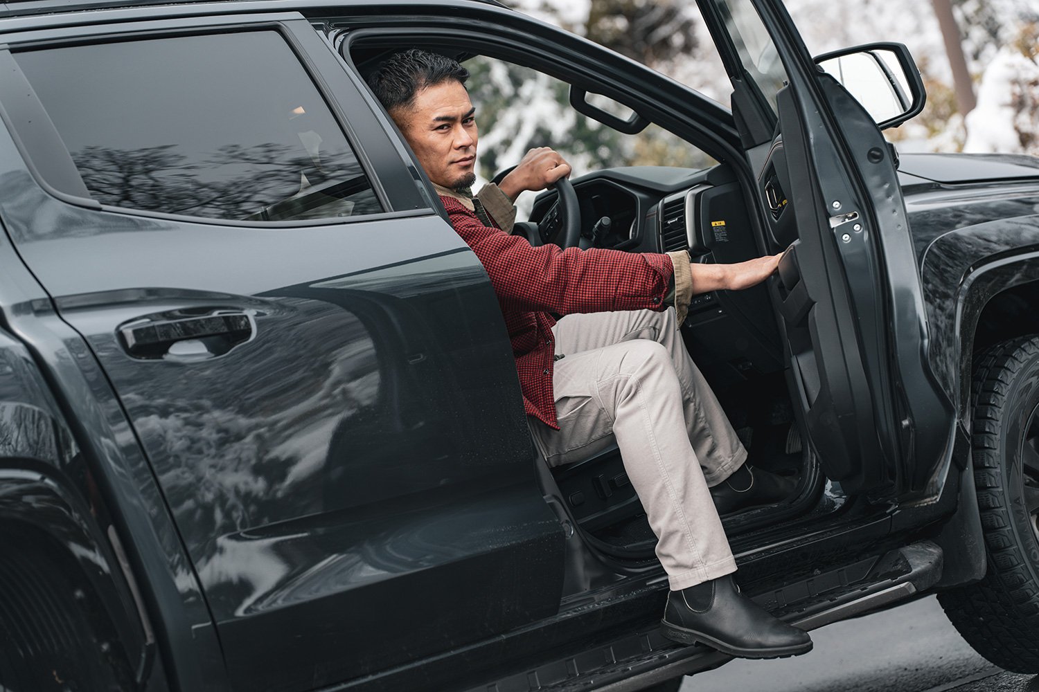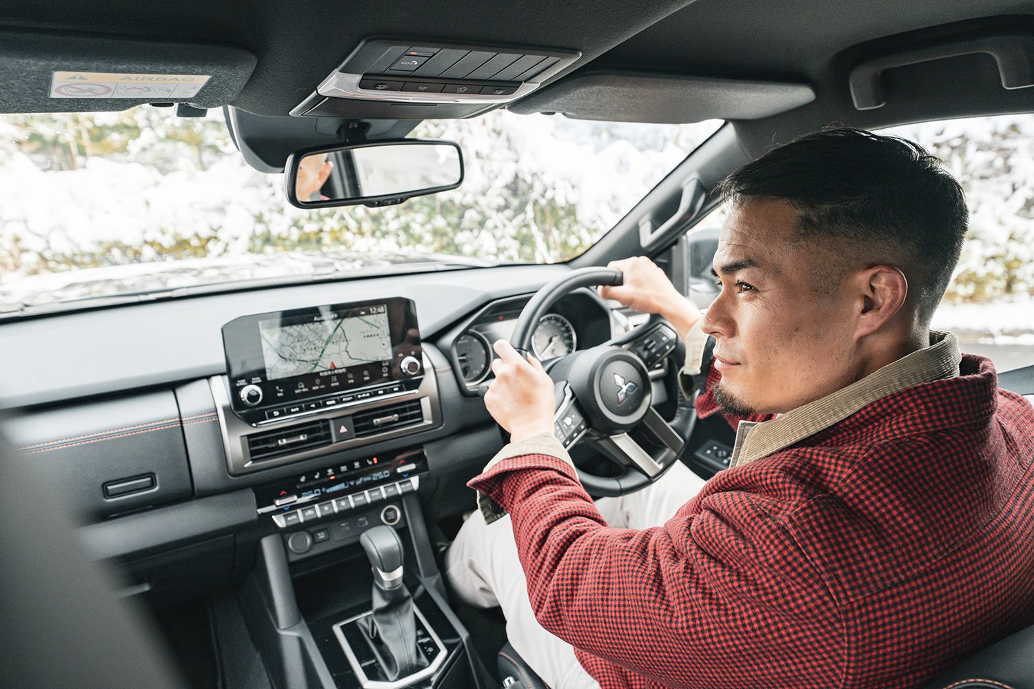 見渡す限り一面の銀世界。東京には珍しく雪が降り積もったこの日、幹線道路を離れたフィールドの雪はゆうに10cmを超えていた。そんな悪コンディションでも、軽快に雪原を駆けるトライトン。ハンドルを握る田村優の顔には笑みが浮かんでいた。