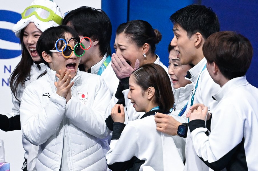 2022年北京五輪の団体戦で銀メダルを獲得した選手たち。試合後、彼らは次のオリンピックへ向けた目標を共有していたのである。坂本花織が振り返るこの場面こそが、今回の快挙への第一歩だった。