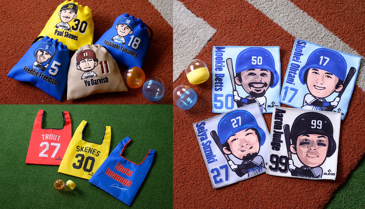 選手たちをデフォルメしたイラストをあしらったMLBPAライセンス巾着袋、ミニタオル。そして、背番号と選手たちのサインをデザインしたMLBPAライセンスエコバッグは、カプセルトイとして全国展開される。こちらも大谷翔平や山本由伸、ダルビッシュ有をはじめ、ポール・スキーンズやムーキー・ベッツ、フレディ・フリーマンなど、全10選手が登場する。