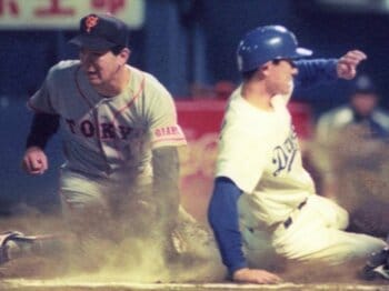 1993年、巨人・槙原の暴投で生還する中日・前原博之
