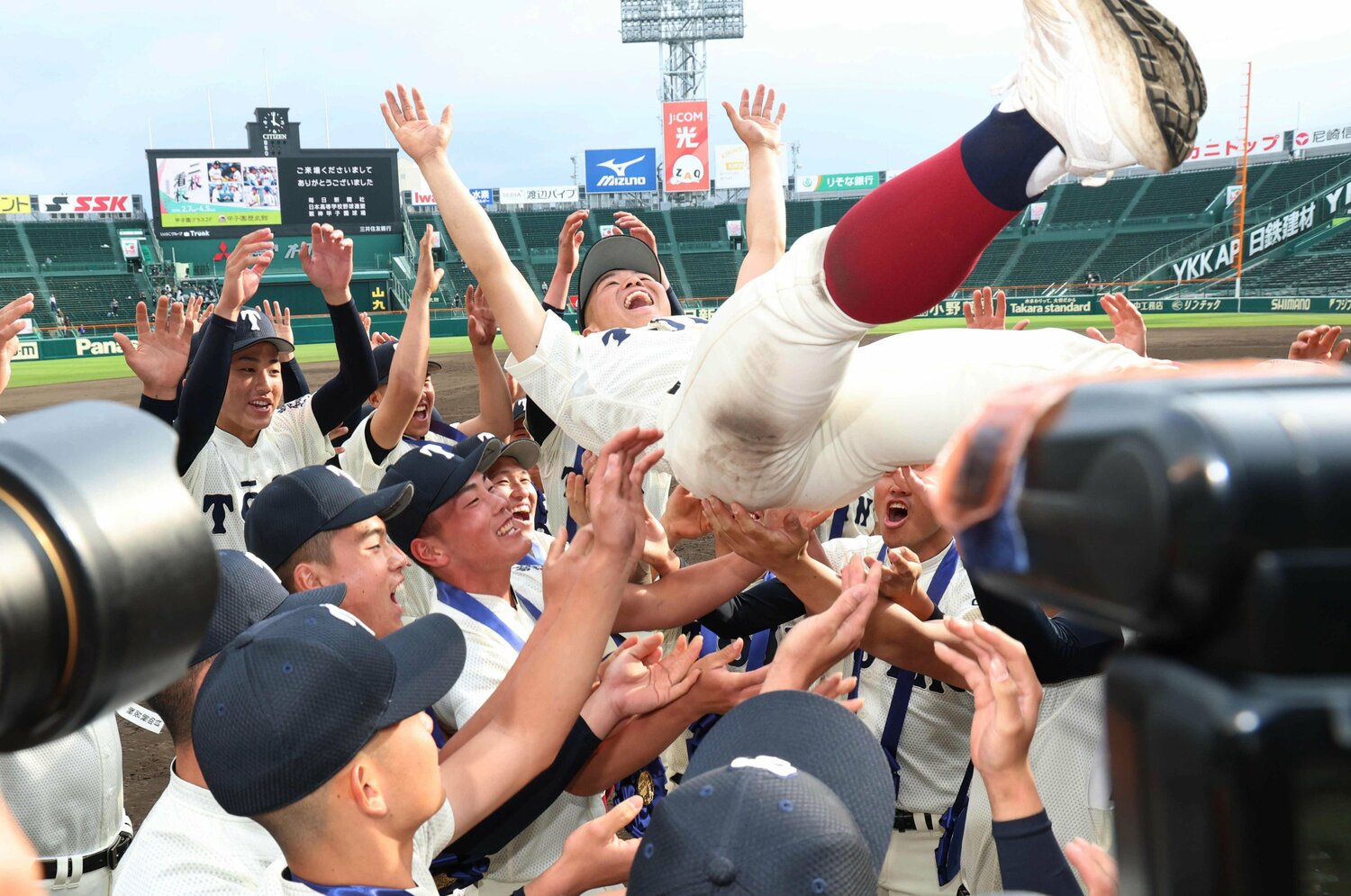 指揮官は今大会、走者を動かして攻め続けた。智弁学園との決勝でも、初回無死一塁から犠打ではなく、ヒットエンドランを選んだ。3回無死一塁でも、3番・内海竣太選手がバスターエンドランでライトへ安打を放つ。続く4番・谷渕瑛仁選手が犠牲フライ、5番・藤田大翔捕手の二塁打で2点を追加した。