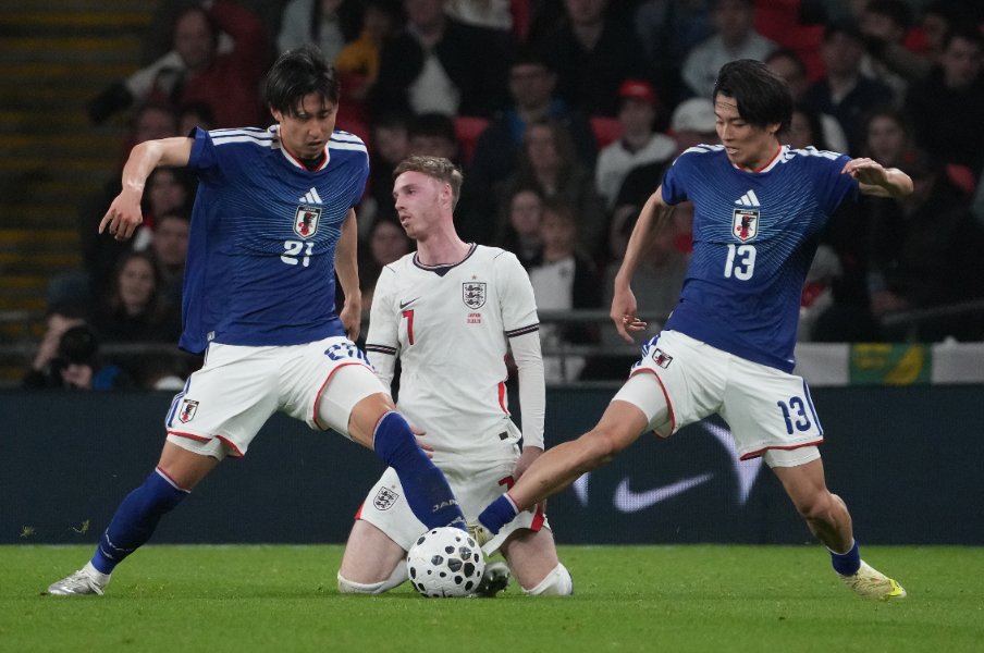 コール・パーマーのボールを奪う伊藤洋輝と中村敬斗。チェルシー所属の名手に決定的な仕事をさせなかった