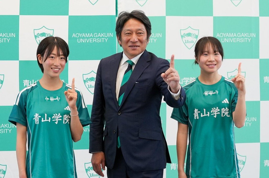 女子駅伝チームの創設を発表した青学大の原晋監督。立命館宇治高の芦田和佳と須磨学園高の池野絵莉が一期生に