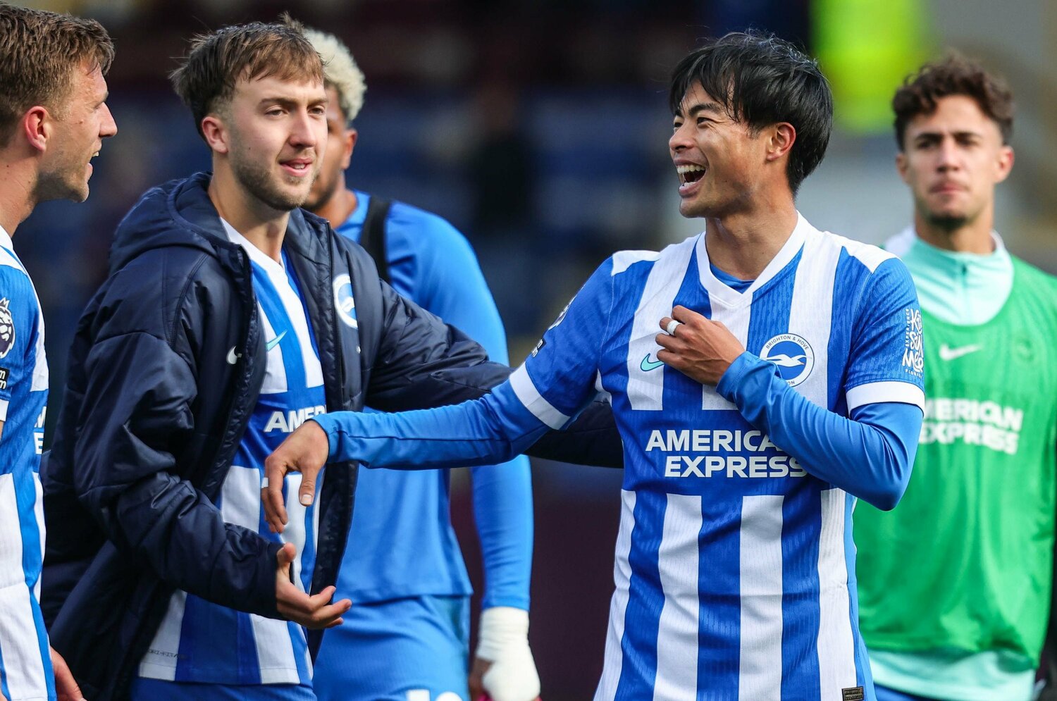 4月11日、途中出場したバーンリー戦。勝利後にチームメイトと笑顔を見せた三笘薫(28歳)