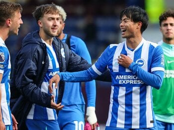 4月11日、途中出場したバーンリー戦。勝利後にチームメイトと笑顔を見せた三笘薫(28歳)
