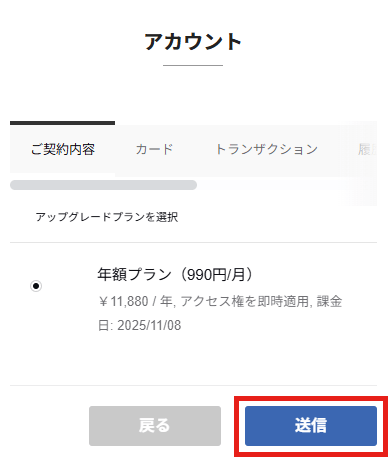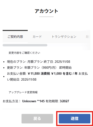 ④ プラン変更内容を確認の上「送信」を選択。お得な年額プランにアップグレードされます