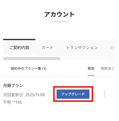② アカウントページの「ご契約内容」タブを開き、「アップグレード」を選択