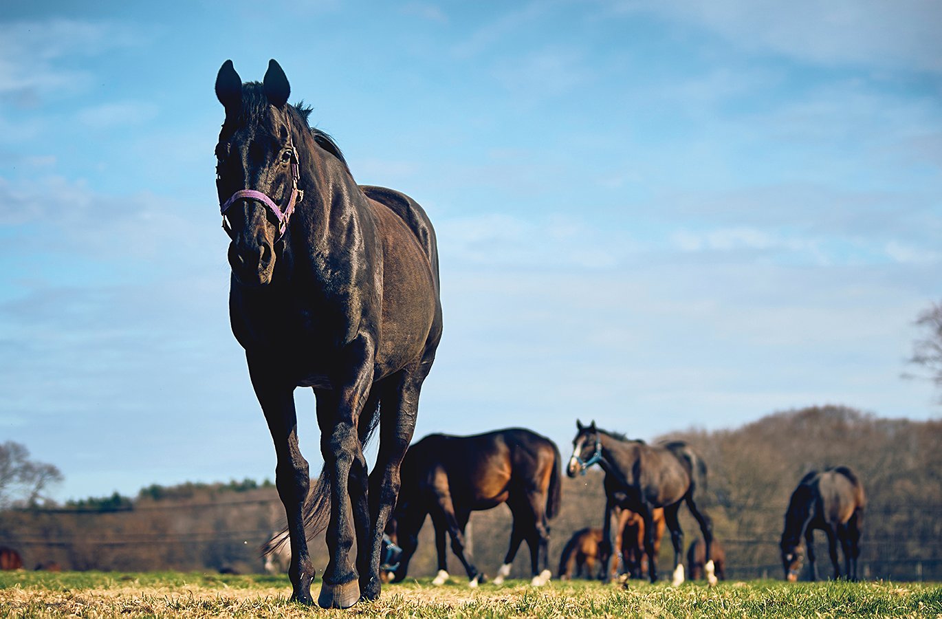 イヤリングと呼ばれる中間育成の馬の放牧地で、20頭ほどの1歳馬たちが思い思いに動き回っている。放牧は夜間も行われ、何頭かに装着されたGPS機器で運動量が管理されている。そんな仔馬の群れに、1頭だけ大きな馬が混じっている。右後ろの脚先以外は馬体も顔も真っ黒なその馬は、追分ファームの生産馬で、2012年ダービーの2着馬フェノーメノだった。
