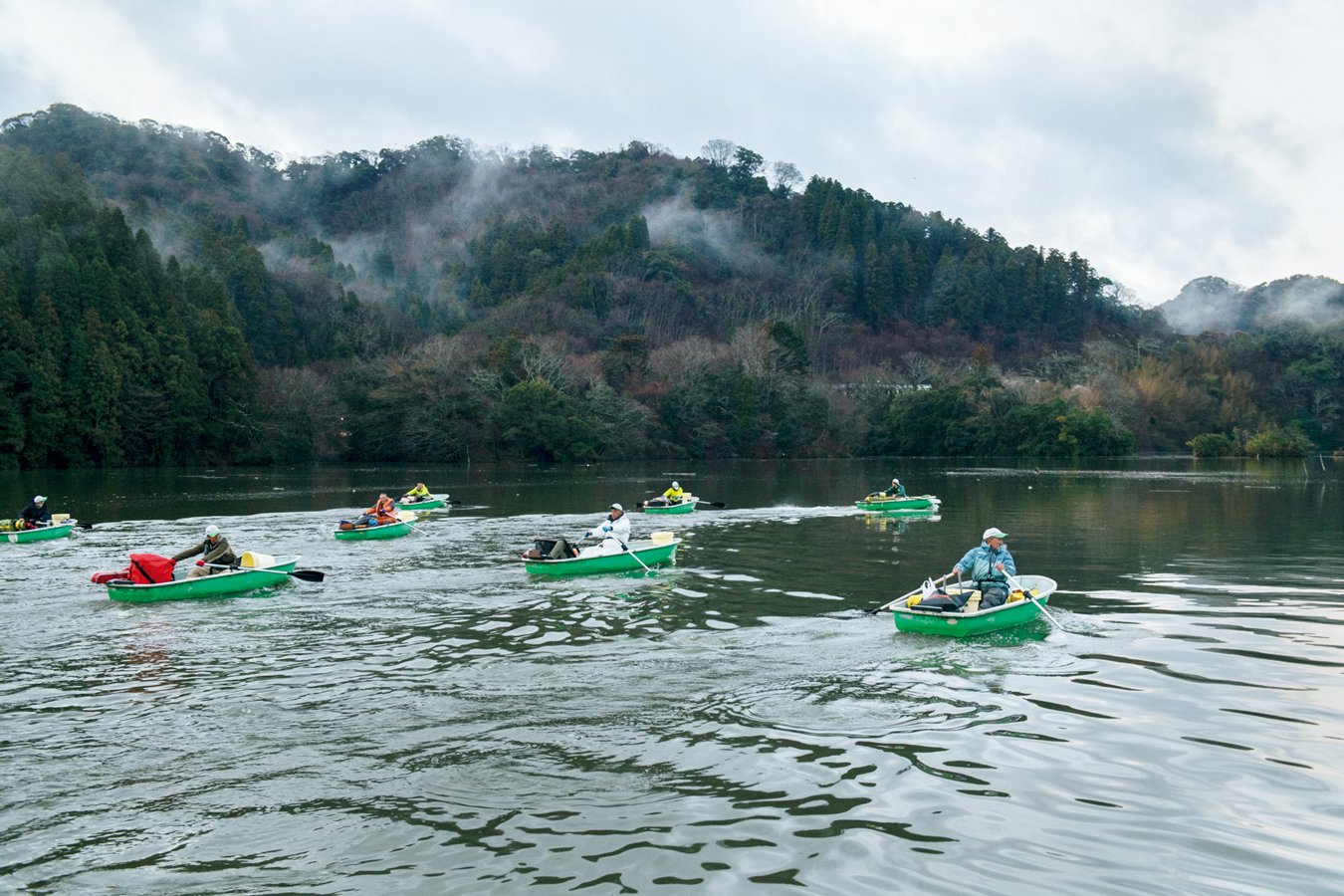 空が白み始めた朝6時に号令がかかり、一斉に出舟していく。それぞれが狙ったポイントに入るための、ボートの手漕ぎ競争が始まる。会長を務める西田一知は、若手の頃には本気で漕ぎすぎて酸欠になり「何度もポイントで吐きましたよ」と笑った。80歳を超える会員たちも含めて参加者43名がオールをバチバチとぶつけながら漕ぎ出すさまは圧巻で、それだけ勝負に本気であることが伝わってくる。