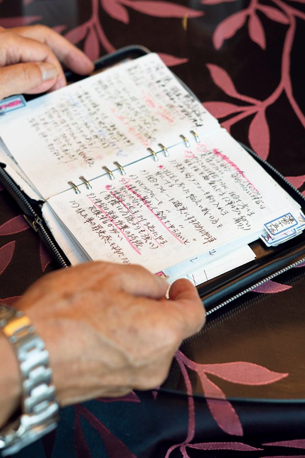 球界の名伯楽と謳われた内田順三の黒い革手帳には力強い筆致の文字がぎっしり詰まっている。「選手の育成」「打撃プロセス」「練習十五ヶ条」「コーチの条件」などとシールで分類し、赤やピンクの下線を引いている。選手、指導者として勤続50年の日々のなかでまとめた教訓である。