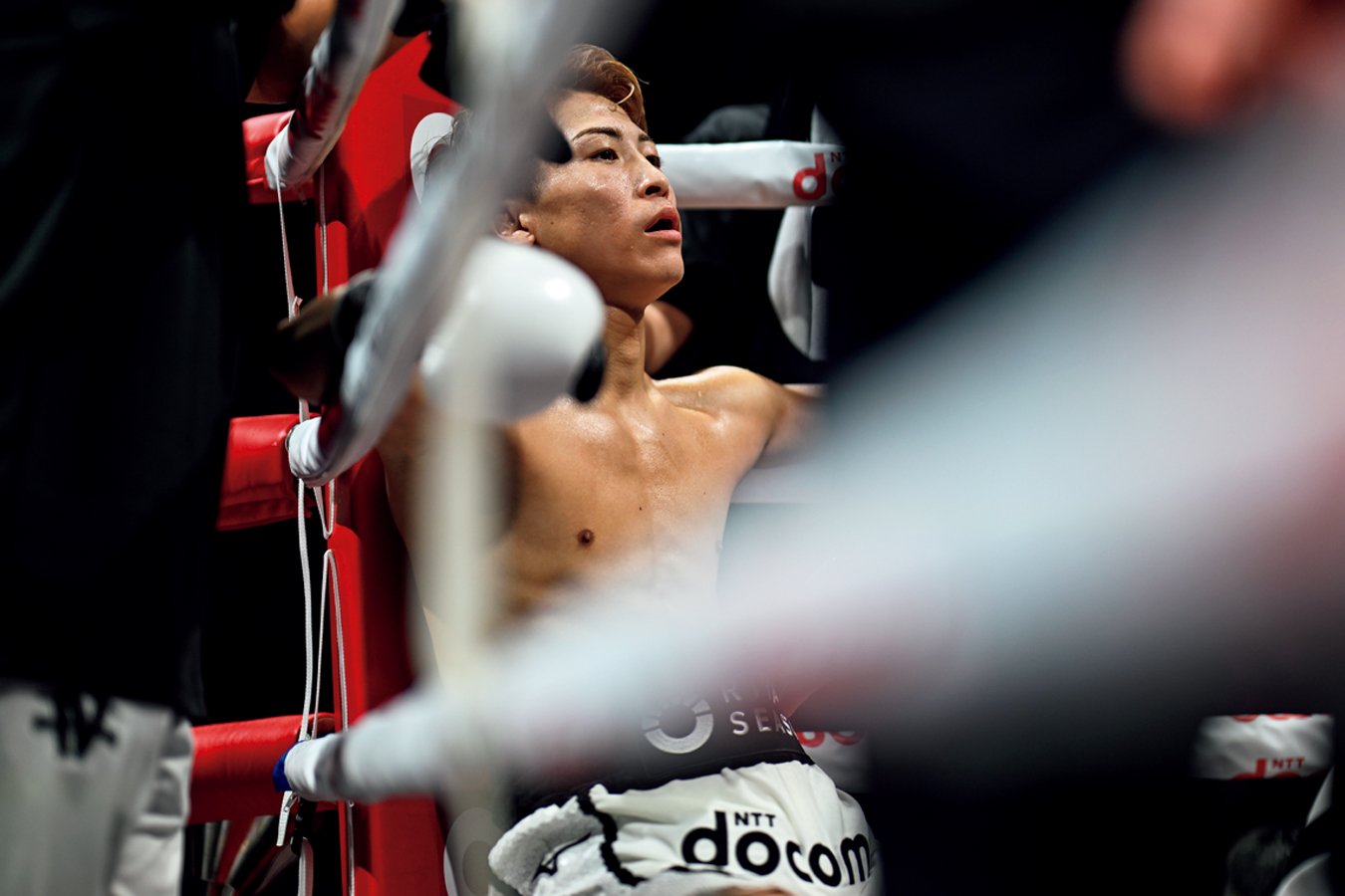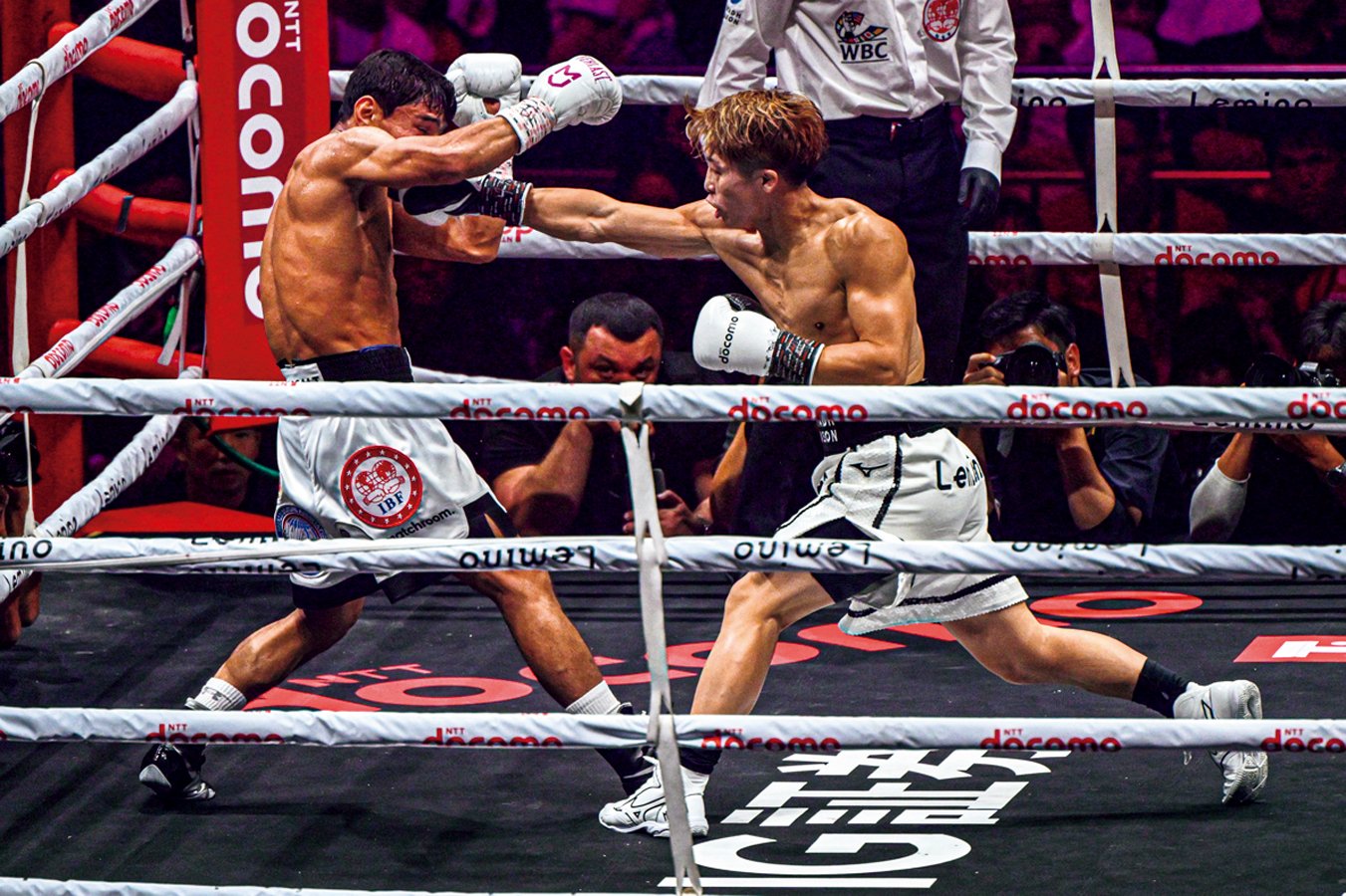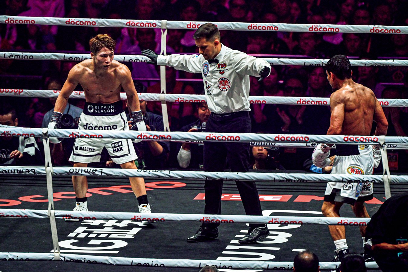 距離が変われば、ディフェンスの方法が変わってくるのも必然。相手のパンチを受け止めるブロッキングよりも距離とボディワークで空振りを誘っていた。これがまた会場を盛り上げたのだ。5回終わりのインターバル中に鼻先ぎりぎりで相手のフックをかわすスロー映像がIGアリーナのモニターに流れたときには、1万6000人の観客からどよめきが起きた。