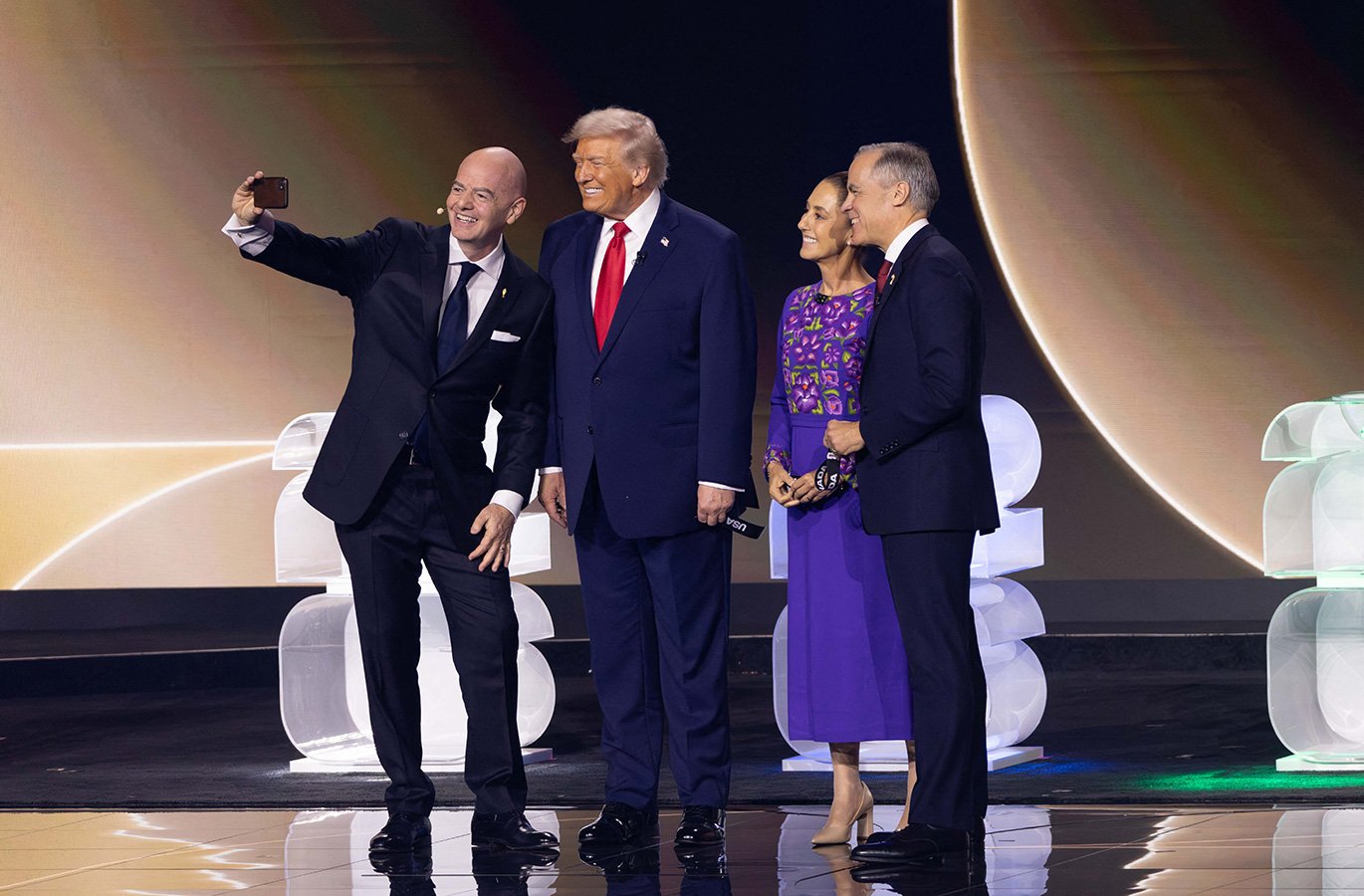 舞台は2026年W杯抽選会。インファンティーノFIFA会長とトランプ大統領が壇上で仲良くポーズをとっている。ふたりの後方には、ついでにとでもいわんばかりにメキシコ大統領とカナダ首相が映り込む。FIFAはノーベル平和賞を狙う大統領のために、FIFA平和賞なるものまで新設し仰々しく授与した。