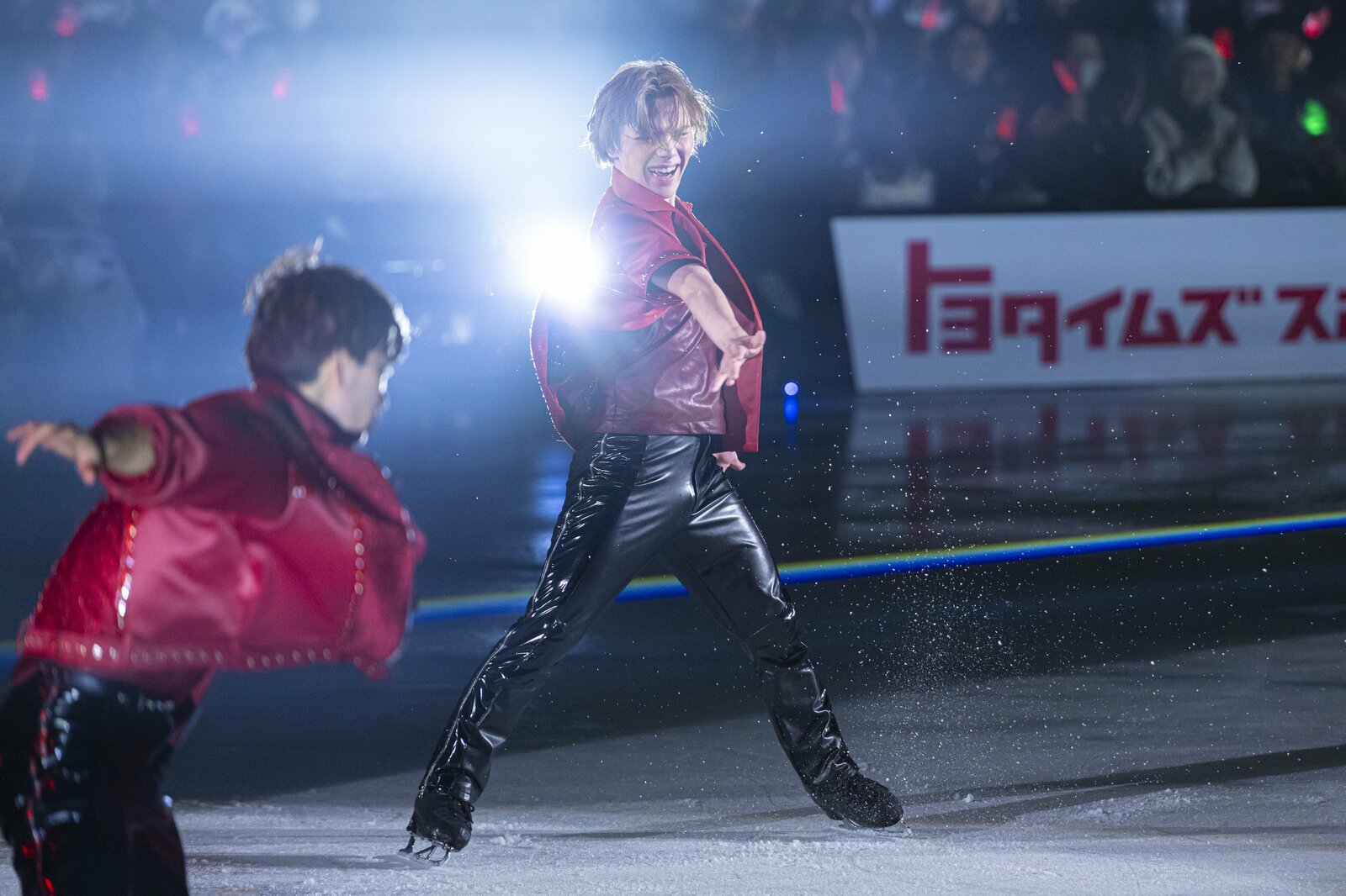 ショーの前半と中盤にあるMCタイム1と2は、90分間滑り続けるショーのなかで、スケーターにとってもファンにとっても、一呼吸置くタイミング。それまで全力でパワーを爆発させていた宇野が息も切れ切れに挨拶したり、キャスト達がファンをあおったり、お互いを茶化し合ったりと、素の表情が見られる時間でもある。