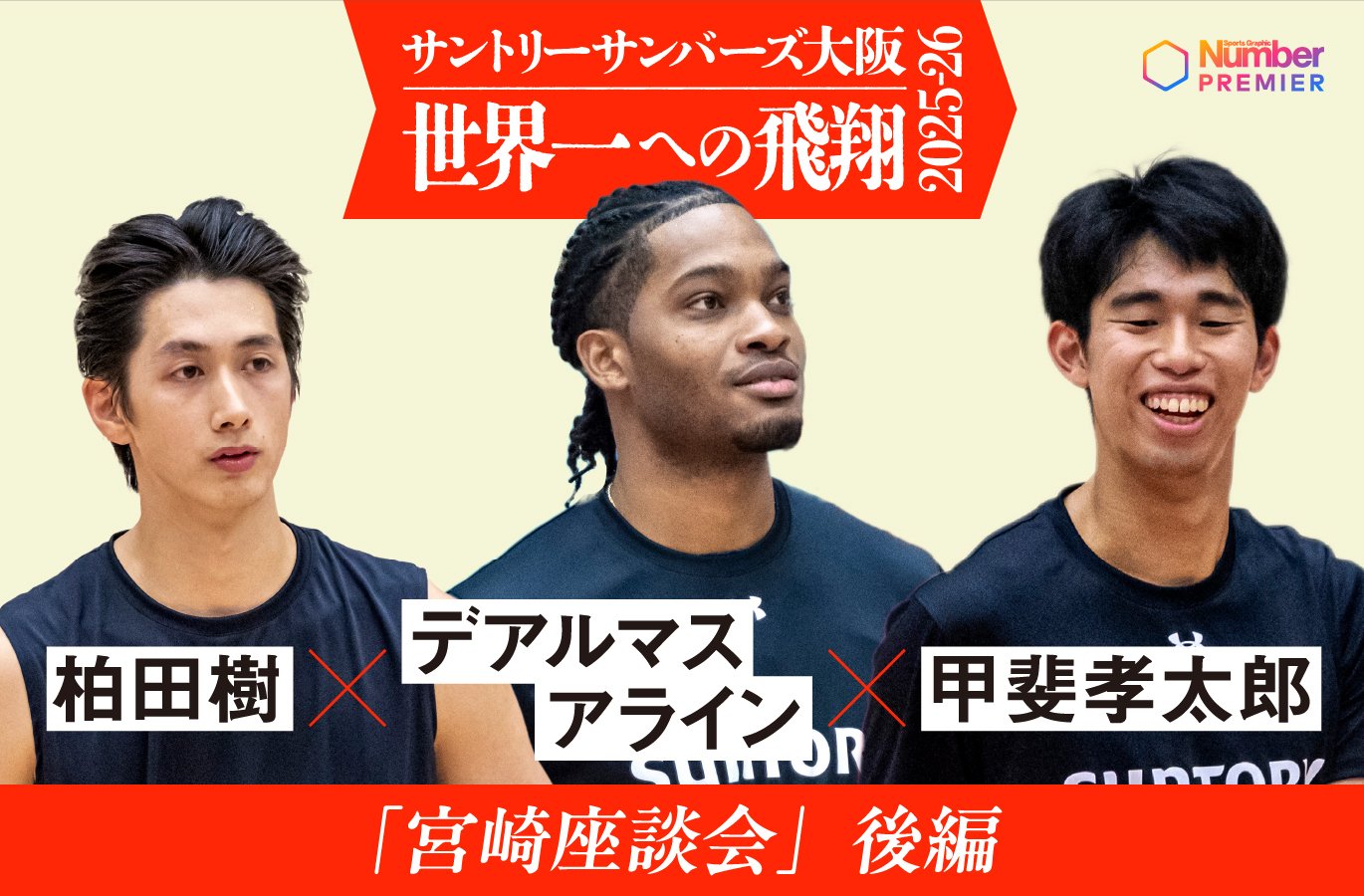 第8回は、宮崎県にゆかりのある柏田樹選手、デアルマス アライン(AJ)選手、甲斐孝太郎選手による『宮崎座談会』の後編。3人はそれぞれ、サンバーズにおいてどんな存在なのかを深掘りします。インタビュアーはライターの米虫紀子さんです。《『宮崎座談会』前編も併せてご覧ください。サイン入りチェキのプレゼントも。応募はこちらから》