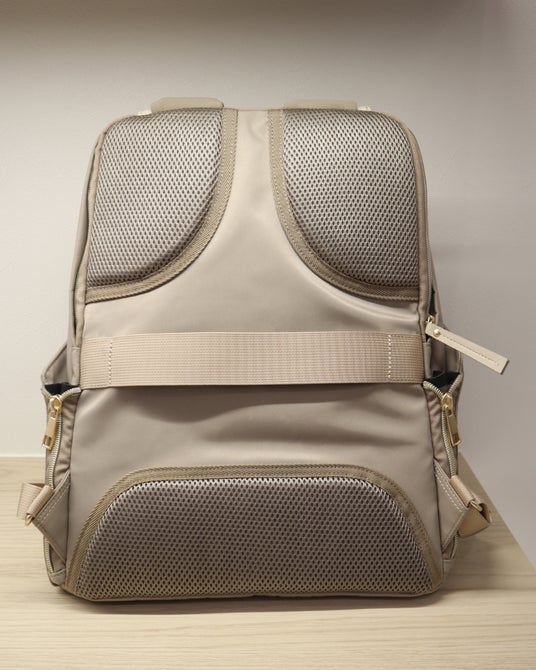 従来は14~15インチPCを収納できるサイズが中心でしたが、本企画は13.3インチPCやA4資料をスムーズに収納できる容量を確保しながら、見た目はコンパクトなサイズ感に仕上げました。ショルダー部分は、カジュアル過ぎない程よい太さに調整しつつ、従来品よりもクッション性を向上。またショルダーと背面部分は人間工学に基づき、メッシュクッションや体に沿うカーブを取り入れることで、肩や腰にかかる負担を軽減しました。そのため長時間背負っていても重さを感じにくく、働くビジネスパーソンを応援する企画となっています。
