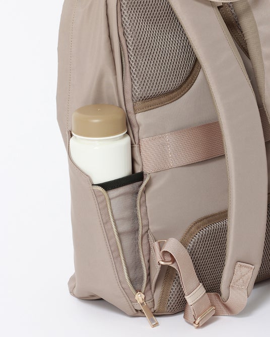 本企画は、時期を問わず蒸れを感じやすい背中や肩の不快感を軽減するため、背面クッションとショルダー内側にはメッシュ素材を取り入れました。また生地表面には撥水加工を施している他、メイン収納ファスナー部分には雨が入りにくいカバーもつけるなど、突然の雨でも安心な仕様となっています。その他上部浅めのポケットには、ハンディファンを入れることで、夏の暑さ対策も行える企画にしました。