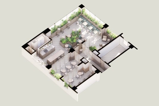 食事や仕事、ちょっとした作業から談笑まで、さまざまな時間を心地よく過ごせます。中央のソファ席は植物によってプライバシーが保たれるよう配慮しました。