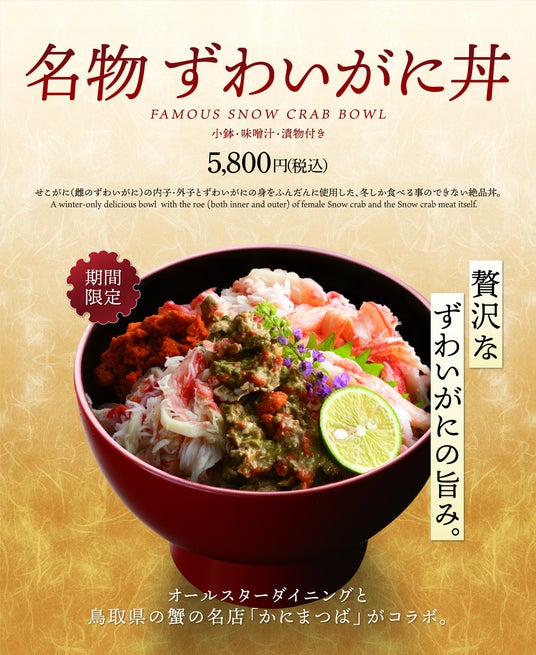 毎年限られた時期にしか味わえない鳥取の親ガニの旨味とずわいがにの身を贅沢に使用した、本コラボだけの特別仕様です。