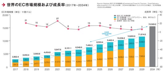 2024年の世界のB2C EC市場規模は、前年比114.5%の7兆4,963億ドル(約1,087兆円)となりました。世界全体の市場としては引き続き拡大傾向にあるものの、パンデミック直後の急成長が落ち着き、特に成熟市場では成長率の鈍化が見られました。今後は、年平均7.6%の成長率で拡大し、2034年には15兆5,692億ドル(約2,258兆円)に達する見込みです。
