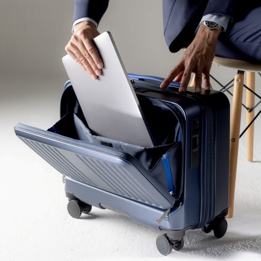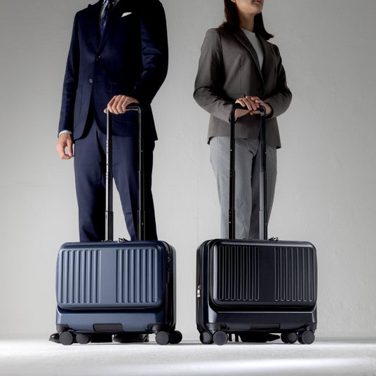 横型モデルは上部に重量あるビジネスバッグ等を載せても安定した走行。機内など限られたスペースでも取り回しがしやすく、ビジネスバッグ感覚で使えます。