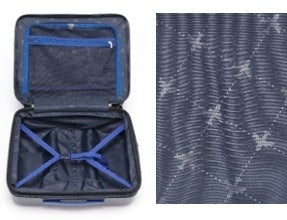 飛行機柄の生地を使用し、ファスナーや荷物固定ベルトはANAをイメージしたブルーで差し色に。