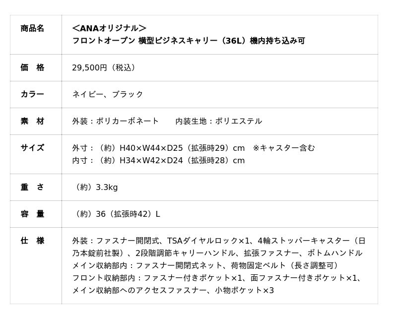 全日空商事株式会社(本社:東京都港区、代表取締役社長:宮川 純一郎)は、「ANAオリジナル フロントオープンキャリー」シリーズより、機内持ち込み可能な横型ビジネスキャリー(36L)を発売します。