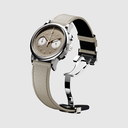 2021年に即完売した「Vert Militaire」に続く、ミリタリーシリーズ第2弾。洗練された“サンドベージュ×ローズゴールド”のコンビネーションが特徴的。フランスのリヴィエラ文化から着想を得たカラーリングと、モダンかつクラシカルな造形が融合し、上品なミリタリーデザインを再解釈したモデルです。ケースは39mmの316Lステンレススチールを採用し、繊細なポリッシュ面とサテン面を組み合わせることで立体的なフォルムを強調。砂地を思わせるサンドベージュのダイヤルには、読み取りやすいアラビアインデックスとレイルウェイトラックを配置し、実用性とデザイン性を両立しています。ホワイトのサブダイヤルと外周のタキメータースケールが全体を引き締め、クラシックスポーツスタイルとしての存在感を際立たせています。