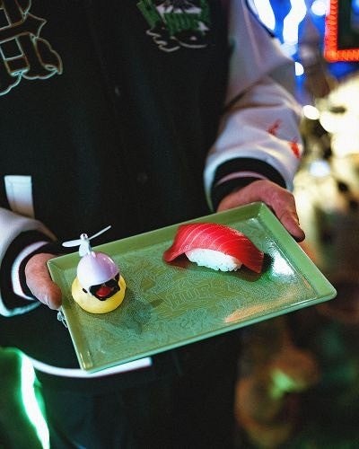 “富士山”や“寿司”など日本を象徴するモチーフを、刺繍やプリントなどの多彩なテクニックで、スタジアムジャケット、ダブルジップフーディー、クルーネックフリース、ビーニー、酒瓶&そばちょこセット、プレート、バックルベルト、マーブルスタッシュボックスなど幅広いアイテムに落とし込みました。