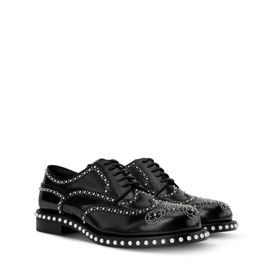 しなやかなレザーを使用し、伝統的なブローグシューズのパーフォレーションを想起させるパールとスタッズで華やかに彩られた「LVオックスフォード ダービー」。装飾的なモノグラム・フラワー パターンをトウキャップにさりげなくあしらいました。レザー&ラバーアウトソールで仕上げた、シューズ・コレクションの定番「LV オックスフォード」ラインからの1足。