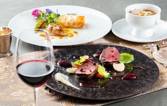 前菜のハンガリー産のフォアグラは、林檎とレーズンを巻いたシュトゥーデルを添えてご提供、メイン料理の「鹿ロースのロティ」は、中欧を代表する赤ワイン用のブドウ「ブラウフレンキッシュ」の香りをまとわせてじっくりと焼き上げた一品です。さらに、デザートにはウィーン発祥のチョコレートケーキ「ザッハトルテ」をご用意し、博多座の舞台の感動とその余韻に浸るひとときをお過ごしいただけます。ゆったりとした空間で全7品のフルコースをご堪能ください。